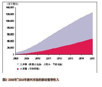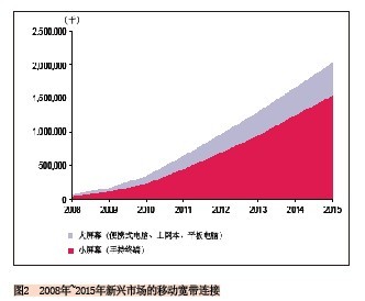 另外一個(gè)預(yù)測(cè)也可說明這一趨勢(shì):2010年到2015年小屏幕移動(dòng)寬帶連接的復(fù)合年均增長(zhǎng)率為45%,而大屏幕的復(fù)合年均增長(zhǎng)率為36%,到2015年新興市場(chǎng)上將有16億的小屏幕連接和近4.59億的大屏幕連接。