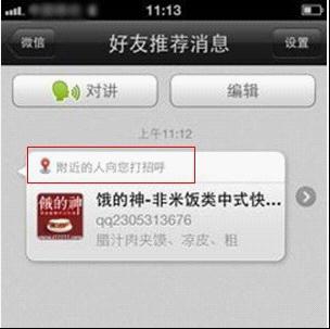 最近,網(wǎng)絡(luò)上流傳著這樣一幅截圖:一家叫“餓的神”的快餐店在午間向附近的人打招呼,以宣傳自己的快餐生意,乍一看這種形式,簡直是超越了空間的電子傳單啊。看來微信這種交友利器,已經(jīng)突破了傳統(tǒng)交流工具的定義,開始向更寬的領(lǐng)域延伸。