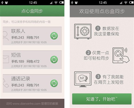 點(diǎn)心盒同步使用十分方便,在手機(jī)上安裝客戶端,通過(guò)注冊(cè)獲取賬號(hào),登陸后進(jìn)入軟件的主界面,僅需輕點(diǎn)同步按鈕,即可將聯(lián)系人、短信和通話記錄同步到點(diǎn)心盒網(wǎng)站上。此時(shí),不僅在手機(jī)端,用戶在云端通過(guò)點(diǎn)心盒網(wǎng)站也可以進(jìn)行聯(lián)系人新建、編輯和刪除的操作,并支持聯(lián)系人導(dǎo)入和去除重復(fù)的聯(lián)系人,方便聯(lián)系人管理。