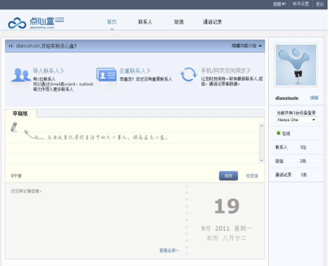 點(diǎn)心盒同步的另一特色功能就是云端收發(fā)短信和查看通話記錄。由于點(diǎn)心盒同步開啟自動(dòng)同步之后是即時(shí)同步的,即使忘記帶手機(jī)也沒有關(guān)系,可以通過(guò)登陸點(diǎn)心盒網(wǎng)站來(lái)查看短信和通話記錄,這樣就可以看到?jīng)]帶手機(jī)期間誰(shuí)聯(lián)系過(guò)自己,可通過(guò)云端進(jìn)行短信收發(fā),而且可利用云端來(lái)快速大量發(fā)送短信。用戶只需一臺(tái)可以上網(wǎng)的電腦或Pad,登錄點(diǎn)心盒,就可以隨時(shí)隨地打開網(wǎng)頁(yè)瀏覽手機(jī)里的資料。