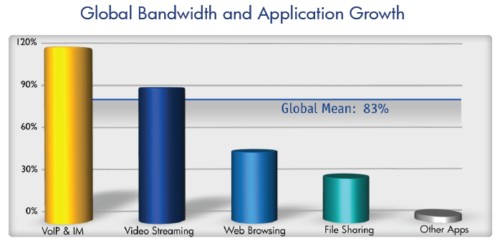 Allot 通訊公司在2012年2月出的報(bào)告中,2011年下半年,視頻流媒體在手機(jī)流量中始終占著絕對(duì)優(yōu)勢(shì),相比2010上半年的占全球帶寬比35%,增長(zhǎng)到了42%;網(wǎng)絡(luò)共享排第二位,占26%,相比2010上半年下降了31%;同時(shí)網(wǎng)頁瀏覽量也有所下降,同期從29%下降到24%;網(wǎng)絡(luò)電話與即時(shí)訊通在下半年僅僅占了3%。整體來看,全球手機(jī)無線業(yè)務(wù)流量在下半年相比上半年增長(zhǎng)了83%,復(fù)合年增長(zhǎng)率為234%。