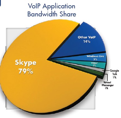 雖然網(wǎng)絡(luò)電話與即時(shí)通訊在下半年的網(wǎng)絡(luò)帶寬中占比仍然很低,它們的申請(qǐng)量證明了其在高速發(fā)展,相比上半年提升了114%。在下半年,Skype占了全球手機(jī)網(wǎng)絡(luò)電話使用量的79%。然而由于新競(jìng)爭(zhēng)者所帶來的壓力,它的份額根據(jù)上半年的82%有所下降,這些新出來的同行包括Viber,它的迅速成長(zhǎng)使其已經(jīng)占到了全球網(wǎng)絡(luò)電話流量的2%,超過了GoogleTalk 及Windows Live(這兩者都占1%)。