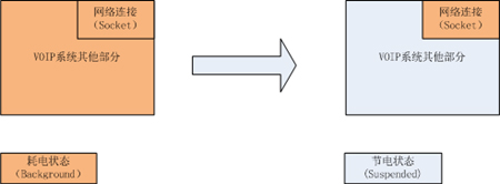 2、程序配置用于 VOIP 業(yè)務(wù)的網(wǎng)絡(luò)連接(Socket),告知系統(tǒng),在程序進(jìn)程被調(diào)度到“掛起(Suspended)”狀態(tài)時(shí)該特殊的網(wǎng)絡(luò)連接需要被系統(tǒng)接管,因此,此時(shí)網(wǎng)絡(luò)連接仍然是活動(dòng)的。當(dāng)網(wǎng)絡(luò)連接有新的數(shù)據(jù)到達(dá)的時(shí)候,程序?qū)摹皰炱穑⊿uspended)” 狀態(tài)被喚醒到“后臺(tái) (Background)”狀態(tài),如果是個(gè)來(lái)電事件,VOIP應(yīng)用則發(fā)起一個(gè)本地提醒事件,此時(shí)用戶(hù)可以在設(shè)備的界面上看到來(lái)電提醒,如果用戶(hù)選擇接聽(tīng)來(lái)電,則 VOIP 應(yīng)用被調(diào)度到前端的“活動(dòng) (Active)”狀態(tài)直接與用戶(hù)交互,否則,回退到低電的“掛起(Suspended)”狀態(tài)。下圖可以看到左圖是傳統(tǒng)的 VOIP 應(yīng)用,在“待機(jī)”狀態(tài)下整個(gè)程序都運(yùn)行在耗電的“后臺(tái) (Background)”狀態(tài),右圖是蘋(píng)果的 VOIP 實(shí)現(xiàn),僅僅網(wǎng)絡(luò)連接運(yùn)行在耗電的“后臺(tái) (Background)”狀態(tài)。其余系統(tǒng)部分運(yùn)行在低電的“掛起(Suspended)”狀態(tài)。