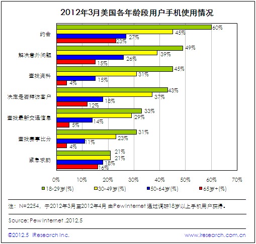 iResearch艾瑞咨詢根據(jù)Pew Internet 2012年5月發(fā)布的數(shù)據(jù)整理發(fā)現(xiàn),美國各年齡段手機(jī)用戶中,18-29歲的用戶使用手機(jī)程度最為頻繁,主要用于“約會”“解決意外問題”及“查找資料”上。相比其他年齡段用戶群,年輕用戶更偏向利用移動手機(jī)來獲取信息。