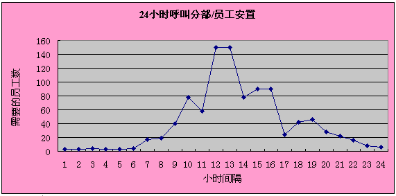 呼叫中心一年中要運(yùn)行365天,也就是說每天需要三次8小時(shí)工作替換。一天中員工需求量會隨著呼叫量高峰期和低估期而波動。下面的圖標(biāo)詳細(xì)說明了平時(shí)可能需要的變化的員工需求。
