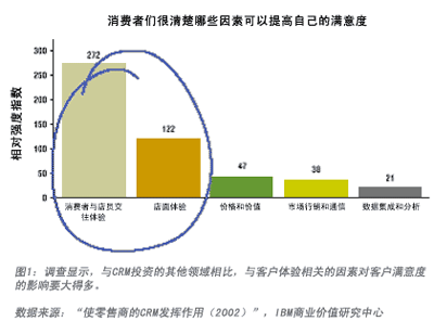 IBM商業(yè)價值研究中心的一項研究結(jié)果印證了筆者的設(shè)想。IBM 對美國10家零售商的消費群進行了調(diào)查,其中包括5家表現(xiàn)較好的(過去3年中在店面單位面積銷售和凈收入的增長方面做得很好)和5家表現(xiàn)較差的(業(yè)績持平或出現(xiàn)下滑)。調(diào)查發(fā)現(xiàn),領(lǐng)先的零售商能夠同時有效使用關(guān)鍵的滿意度推動因素和關(guān)系要素,為消費者提供最佳的“總體體驗”,即一家公司(或一個品牌)有形、無形地給客戶留下的總體印象。該項調(diào)查的統(tǒng)計分析結(jié)果發(fā)現(xiàn)了5組滿意度推動因素: