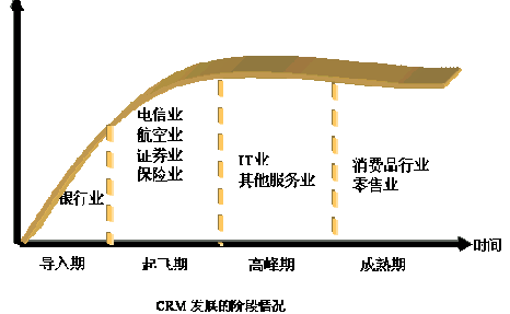 從圖中我們可以大致看出CRM的發(fā)展情況。保險(xiǎn),電信行業(yè)對這比較重視,而且得到了一定的應(yīng)用。但是在其他行業(yè)中的發(fā)展仍然比較緩慢。面對中國的龐大市場,從CRM的發(fā)展中不難看出:會(huì)隨著經(jīng)濟(jì)的發(fā)展得到長足的發(fā)展。隨著經(jīng)歷早期客戶是蒙昧期,后來是觀察期,現(xiàn)在是選擇期,CRM市場可能出現(xiàn)爆炸性的增長。CRM本身是很好的,發(fā)展到一定階段,引導(dǎo)期已經(jīng)過了,又會(huì)發(fā)展起來。