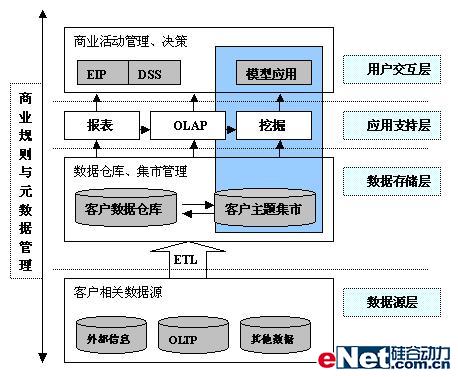 從上面的分析型CRM體系結(jié)構(gòu)圖可以看出,整個(gè)架構(gòu)分為數(shù)據(jù)源層、數(shù)據(jù)存儲層、應(yīng)用支持層和用戶交互層總共四層。數(shù)據(jù)源層包括了企業(yè)常用信息系統(tǒng)和一些外部系統(tǒng)的數(shù)據(jù)源,比如涉及到客戶交互的一些交易系統(tǒng),服務(wù)系統(tǒng),各系統(tǒng)間的客戶數(shù)據(jù)是分散的,而且可能重合,出現(xiàn)不一致的問題;數(shù)據(jù)存儲層是為了整個(gè)企業(yè)有集中統(tǒng)一的客戶視圖,通過從各源系統(tǒng)抽取數(shù)據(jù),進(jìn)行整合后的數(shù)據(jù)倉庫,而且在客戶數(shù)據(jù)倉庫的基礎(chǔ)上,可以建立相關(guān)分析之用的客戶主題數(shù)據(jù)集市;應(yīng)用支持層除了支持復(fù)雜,智能化報(bào)表查詢外,還支持OLAP分析,提供數(shù)據(jù)挖掘功能;用戶交互層提供分析和挖掘結(jié)果同企業(yè)管理、決策層和企業(yè)其它服務(wù)人員和客戶的交互,形成反饋機(jī)制,從而有效地利用分析和挖掘得到的有用知識。