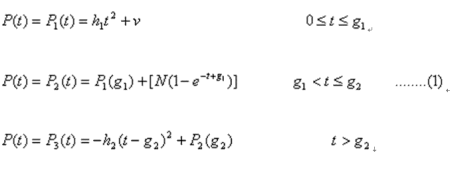 式中,P(t)為客戶第t個時間單元的客戶利潤。P1(t)為一二次增函數(shù),表示客戶利潤以一定的加速度(2h1)快速增加;P2(t)為一上漸近線函數(shù),表示客戶利潤一直增長但增長越來越慢,且始終越不過一個利潤最高限,最高限為(P1(g1)+N);P3(t)為一個二次降函數(shù),表示客戶利潤以一定的加速度(2h2)銳減。參數(shù)v、h1、h2、g1、g2、N都是正常數(shù)。v是客戶第一次購買帶給公司的利潤,通常這個值不高,甚至接近0(不考慮獲取成本,否則v常為負值)。h1、h2反映了客戶利潤增長和下降的加速度。g1、g2是利潤曲線發(fā)生轉(zhuǎn)折的兩個時點。N是g1時點后利潤總增幅的極限。