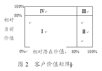 在上一步中,我們預測出客戶當前相對價值和客戶相對潛在價值;于是可據(jù)此建立客戶價值矩陣。根據(jù)Pareto原理,客戶當前相對價值中有20%的屬于優(yōu)質(zhì)客戶,80%屬于一般客戶,同樣客戶潛在價值中也如此。因此,下面的客戶價值矩陣的橫、縱軸各自都以80%分段,