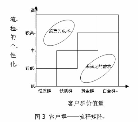 圖中橫軸代表客戶群價值量,從“鉛質(zhì)客戶群”到“白金客戶群”過渡?v軸表示業(yè)務流程的個性化程度(包括流程的靈活性、流程的活動承擔者的設置、流程中的活動要素的配置等),是一種與客戶群價值量相對應的供應方面的流程特征。左上方的橢圓圈表示對價值量低的鉛質(zhì)群、鐵質(zhì)群客戶設置了個性化較高的流程,這表明企業(yè)資源配置不合理,因而有些資源的投入大于產(chǎn)出,從而產(chǎn)生過高的成本。右下方的橢圓圈則代表了未被滿足的需求。用很標準化的、缺乏人情味的流程向高價值的黃金群客戶、白金群客戶提供產(chǎn)品和服務,將難以讓這些客戶滿意,從而導致高價值客戶的流失。圖的中間部分,四個矩形框的對角線位置則代表了客戶群價值和流程個性化恰當?shù)钠ヅ。因此,企業(yè)可在四個矩形框的各自兩條對角線相交部分設置“白金客戶群流程、黃金客戶群流程、鐵質(zhì)客戶群流程、鉛質(zhì)客戶群流程”這四類流程,以此找到客戶群——由資源創(chuàng)造的產(chǎn)品和服務——流程群的最佳匹配。從圖中也可看出,鉛質(zhì)客戶群流程的標準化程度最高,通常不用提供特殊的個性化的服務及產(chǎn)品。白金群客戶流程的定制化則最高,企業(yè)需要為其量身打造流程。顯然這兩個流程的資源分配存在極大的差異。