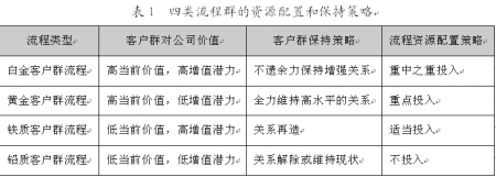 流程由活動、活動的邏輯順序、活動的實現(xiàn)方式、活動的承擔者四個基本要素組成。通過活動的整合來產(chǎn)生“流程多面手”或活動講廢除來減少成本,利用信息技術(shù)將“串聯(lián)”活動變成“并聯(lián)”活動來改變活動斬邏輯順序以提高流程效率,或者改變活動承擔者的數(shù)量或素質(zhì),這些都將導致流程群資源分配的變動。例如,銀行的業(yè)務流程設置:低價值客戶以電子設備的自助服務為主;中價值客戶以柜面服務為主;高價值客戶以大戶室一對一服務為主;設置專業(yè)化的理財中心,由客戶經(jīng)理全程代為辦理各項業(yè)務,同時由高素質(zhì)的理財專家根據(jù)客戶的風險收益偏好提供高質(zhì)量的理財產(chǎn)品等?梢姡煌蛻羝淞鞒痰馁Y源配置差異較大。依據(jù)客戶群——流程矩陣,下表描述了四類流程群所對應的四類客戶群的四種資源配置方式。