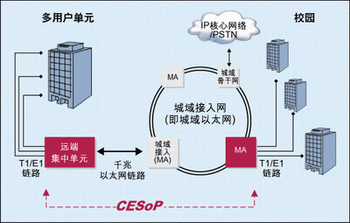 對于擁有眾多用戶的樓宇或校園業(yè)務,運營商可能需要在靠近客戶的地方裝設遠端集中器。遠端集中器集中提供給該樓宇內(nèi)客戶的TDM和/或分組業(yè)務,使用電路仿真并通過點到點連接將業(yè)務傳回最近的城域網(wǎng)絡接入點。