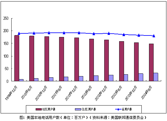 就整體而言,美國(guó)本地電話用戶總量穩(wěn)中有降,移動(dòng)通信的替代作用開(kāi)始顯現(xiàn)。截止到2004年6月,包括住宅和商業(yè)用戶,美國(guó)本地電話用戶總量達(dá)到1.81億戶。但與3年前相比,美國(guó)本地電話用戶數(shù)量實(shí)際減少了近1200萬(wàn)戶。與此同時(shí),移動(dòng)用戶數(shù)量迅速增長(zhǎng)。截止到2004年6月,美國(guó)移動(dòng)電話用戶數(shù)比上年同期增長(zhǎng)13%,達(dá)到1.673億戶,基本接近固定電話用戶的數(shù)量。