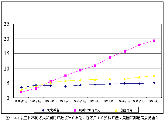 從經(jīng)營(yíng)模式上看,本地非主導(dǎo)運(yùn)營(yíng)商的商業(yè)模式在過(guò)去的5年中發(fā)生了很大變化。在市場(chǎng)剛剛開(kāi)始引入競(jìng)爭(zhēng)的1999年,42.9%的本地非主導(dǎo)運(yùn)營(yíng)商選擇了批發(fā)零售這種進(jìn)入門檻相對(duì)較低的商業(yè)模式,本地電話市場(chǎng)一度活躍著大量地區(qū)性的小運(yùn)營(yíng)商。由于面臨本地主導(dǎo)運(yùn)營(yíng)商的強(qiáng)烈抵制,非綁定網(wǎng)元政策的實(shí)施自公布以來(lái)一再推遲,經(jīng)過(guò)反復(fù)的法律訴訟,美國(guó)最高法院在2002年最終裁定非綁定網(wǎng)元政策合法。自那時(shí)起,AT&T、MCI等全國(guó)性的長(zhǎng)途電話運(yùn)營(yíng)商紛紛通過(guò)租用非綁定網(wǎng)元的方式進(jìn)入本地電話市場(chǎng)。截止到2004年6月,本地主導(dǎo)運(yùn)營(yíng)商已經(jīng)提供了約2150萬(wàn)線非綁定本地用戶線給本地非主導(dǎo)運(yùn)營(yíng)商。CLEC以三種方式發(fā)展用戶的情況如圖2所示。