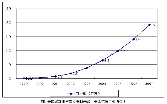 與此同時(shí),Qwest也開(kāi)始在明尼蘇達(dá)州提供類似的VoIP業(yè)務(wù),并計(jì)劃在近期內(nèi)推向全國(guó)。Verizon與北電網(wǎng)絡(luò)簽訂了大筆的訂單,計(jì)劃全面改造其本地電話網(wǎng)絡(luò)提供的VoIP業(yè)務(wù)。一些曾經(jīng)著名的網(wǎng)絡(luò)電話公司(如Net2Phone)也開(kāi)始進(jìn)入傳統(tǒng)電話市場(chǎng)。截止到2004年2月底,Vonage的全I(xiàn)P網(wǎng)絡(luò)已經(jīng)擁有13萬(wàn)VoIP用戶。據(jù)美國(guó)電信工業(yè)協(xié)會(huì)預(yù)測(cè),到2007年年末,全美的VoIP用戶將會(huì)達(dá)到1920萬(wàn)戶,如圖3所示。