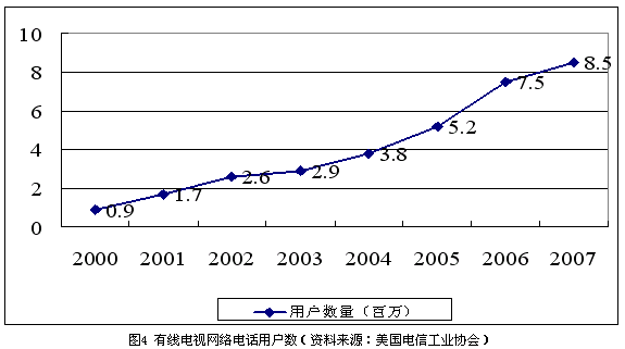 隨著有線電視用戶數(shù)量逐漸達(dá)到飽和,有線電視公司也在積極尋找新的利潤(rùn)增長(zhǎng)點(diǎn)。在過(guò)去的7年中,有線電視公司投入了高達(dá)800億美元的資金用于網(wǎng)絡(luò)升級(jí)改造,現(xiàn)在,大部分有線電視網(wǎng)絡(luò)已經(jīng)可以提供包括寬帶接入、本地和長(zhǎng)途電話、數(shù)字電視、視頻點(diǎn)播等在內(nèi)的一攬子服務(wù)。到2004年末,有線電視公司已經(jīng)擁有超過(guò)380萬(wàn)的本地電話用戶。根據(jù)美國(guó)電信工業(yè)協(xié)會(huì)的估算,到2007年,全美將會(huì)有超過(guò)800萬(wàn)的用戶選擇基于有線電視網(wǎng)的基本電信業(yè)務(wù),如圖4所示。