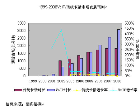2000年以來,IP長話憑借明顯的資費(fèi)優(yōu)勢,對傳統(tǒng)長話形成了有力的競爭,在通話量上已趕超了傳統(tǒng)長話。也正是由于IP長話的低資費(fèi),在其通話量大幅度增加的同時,也導(dǎo)致了國內(nèi)長話網(wǎng)總體收入的下降,長途電話IP化的趨勢十分明顯。總體而言,中國VoIP市場仍蘊(yùn)藏著非常大的潛力,按照3G和NGN的部署速度,
