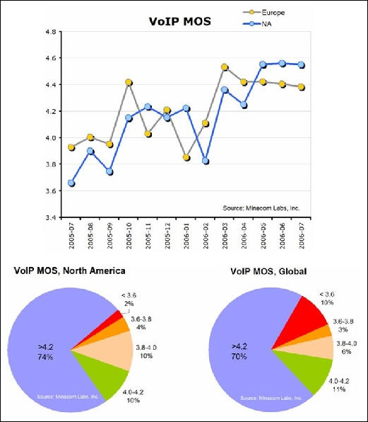 Minacom最新調(diào)研表明,一年來VoIP電話質(zhì)量和聯(lián)結(jié)速度都超過傳統(tǒng)標準公共開關(guān)電話。電話質(zhì)量得分Mean Opinion Score (MOS)數(shù)據(jù)表明,VoIP得分是4.2,而標準公共開關(guān)電話得分3.9。85%的IP電話質(zhì)量和穩(wěn)定性都超過標準公共開關(guān)電話。對電話聯(lián)結(jié)速度,VoIP的MOS得分是平均8.2秒,傳統(tǒng)電話時間更長,平均為8.9秒。這里的IP電話服務指商業(yè)企業(yè)級應用,不是MSN,雅虎通之類免費IP電話個人應用。比較而言,北美IP電話質(zhì)量優(yōu)于歐洲。