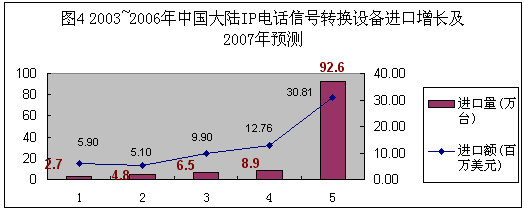 圖4:2003-2006年中國(guó)大陸IP電話信號(hào)轉(zhuǎn)換設(shè)備進(jìn)口增長(zhǎng)及2007年預(yù)測(cè)。