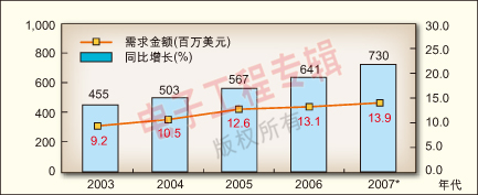5.IP電話信號(hào)轉(zhuǎn)換設(shè)備市場(chǎng)需求將不斷增長(zhǎng)。2006年,中國(guó)大陸IP電話信號(hào)轉(zhuǎn)換設(shè)備的總需求規(guī)模為6.41億美元,同比增長(zhǎng)13.1%;預(yù)計(jì)今年的總規(guī)模將達(dá)7.3億美元,同比增長(zhǎng)13.9%(見(jiàn)圖6)。