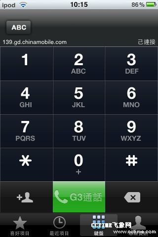 “G3通話”客戶端的用戶界面與iPhone撥號(hào)界面極為相似,并標(biāo)注有139.gd.chinamobile.com的網(wǎng)址,不過(guò)目前該網(wǎng)址無(wú)法進(jìn)入。該客戶端可提取系統(tǒng)自身聯(lián)系人列表,方便用戶撥打網(wǎng)絡(luò)電話。通話界面也與iOS4中的通話界面完全相同。