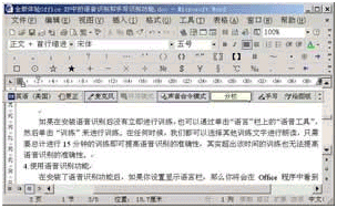如果你要選擇菜單、工具欄、對(duì)話框(只適用于美國(guó)英語)以及任務(wù)窗格(只適用于美國(guó)英語)項(xiàng)目,請(qǐng)選擇"聲音命令"模式。例如,在用鼠標(biāo)或鍵盤選擇要設(shè)置其格式的文本后,只需朗讀所需的命令即可完成有關(guān)操作,如果要更改字體格式,我們可以說"字體"來打開"格式"工具欄上的"字體"框,然后說出字體名;如果你要格式化所選的文本,可以說"黑體"或"下劃線"。