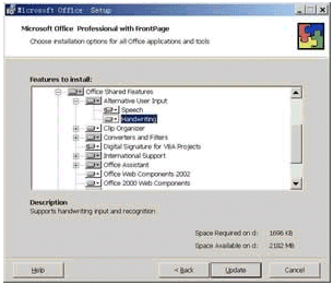 如果是首次使用手寫識(shí)別,那么需要通過執(zhí)行自定義安裝來安裝本功能。注意無法從"工具"中找到類似"語音"的"手寫"命令,你只能通過插入Office XP光盤的方法進(jìn)行自定義安裝,其安裝步驟與安裝自定義安裝語音識(shí)別功能一致,不過這次是從"Office 共享功能"旁,單擊"中文可選用戶輸入方式"旁,單擊"手寫輸入"(如圖15所示)。