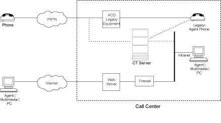 計算機電話集成 (CTI) 服務器與Internet呼叫中心網管可以通過局域網有個雙向的通信.呼叫中心服務器接受向內的網站來的呼叫, 把它轉換成標準的電話接口,