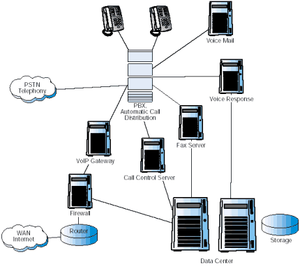 圖1描述了當(dāng)前一個(gè)典型的復(fù)雜的企業(yè)通信系統(tǒng)配置。連接到PSTN的主要部分PBX/KTS,仍然是系統(tǒng)的核心,提供了交換和自動(dòng)呼叫分配的功能。一系列增加的應(yīng)用通過(guò)附屬服務(wù)器連接到PBX/KTS上。很多附屬服務(wù)器也連到數(shù)據(jù)中心上,因?yàn)樗鼈冃枰L問(wèn)企業(yè)的數(shù)據(jù)。 使現(xiàn)有情況變得更為復(fù)雜的是,Internet正在變?yōu)椴豢扇鄙俚纳虅?wù)工具,各公司紛紛安裝VoIP以降低網(wǎng)絡(luò)成本,滿(mǎn)足多媒體通信的需要。這些服務(wù)由企業(yè)防火墻后的網(wǎng)關(guān)提供,這個(gè)網(wǎng)關(guān)也是連接到PBX/KTS上的。