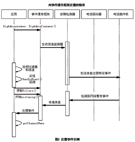 。。在這個(gè)事務(wù)中的主要部件是應(yīng)用程序、板卡的設(shè)備驅(qū)動(dòng)器和管理軟件(包括故障檢測(cè)器和事件服務(wù),事件服務(wù)中同時(shí)包括事件通告框架)。當(dāng)電話板卡發(fā)生DSP故障時(shí),板卡上運(yùn)行的固件通過(guò)發(fā)送一條消息通知控制程序。控制程序是一個(gè)在初始化時(shí)注冊(cè)了不同告警和故障的故障檢測(cè)器。當(dāng)它收到這個(gè)故障通告后,控制器在事件服務(wù)的事件通告框架的隊(duì)列中增加一個(gè)事件。最后,使用回調(diào)函數(shù)通知應(yīng)用程序。此時(shí),應(yīng)用程序可以處理這個(gè)事件,執(zhí)行必要的操作或者動(dòng)作。
